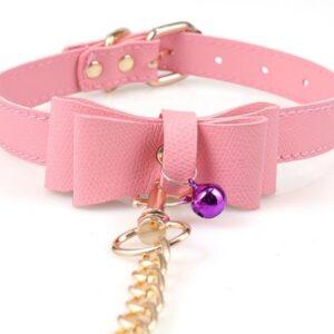 Este collar está diseñado con una pajarita dando un estilo elegante. Se completa con dos cascabeles.La cadena es de metal dorado y mide 1m de longitud. El collar tiene un ancho de 2cm con un tamaño de cuello que va de 35 a 45cm. Fabricado en poliuretano