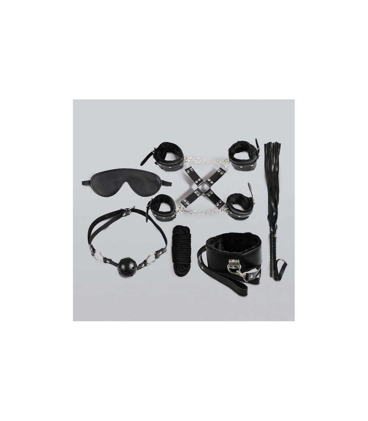 2 juegos de esposas para poder atar muñecas y tobillos o todo junto con la pieza de unión en forma de x… Quietecitos se les controla mejor.
