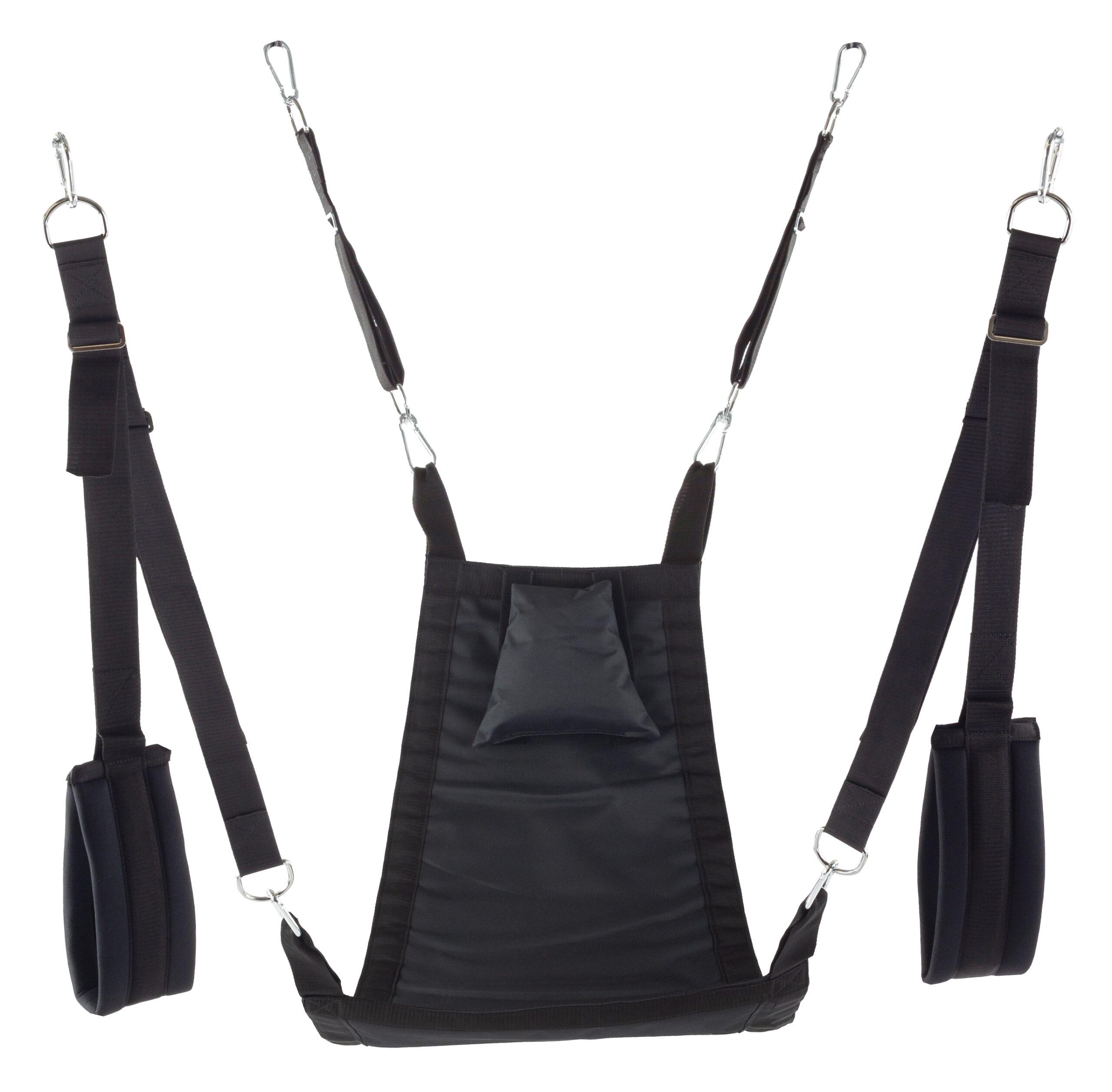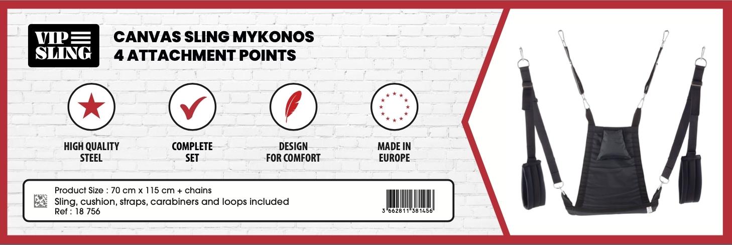 El arnés de tela Mykonos tiene forma triangular para un juego extremo.Dispone de 4 puntos de enganche.Incluye bolsa de almacenamiento, 4 correas ajustables, 2 soportes para los pies y 8 mosquetones.Dimensiones: 35 x 100 x 60 cmFabricado en poliéster 100% con cierres metálicos.Fabricado en Europa