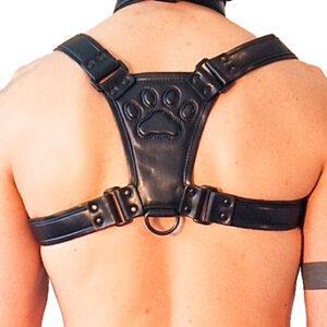 Este arnés negro tiene un panel trasero con una pata de perro en relieve.Las correas son ajustables.Con anillas delanteras y traseras.Talla de pecho: S/M 90 a 105 cm – L/XL 92 a 112 cm.De imitación (poliuretano).