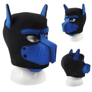 La máscara Puppy Dog On está fabricada en neopreno de color negro-azul.Tiene orejas flexibles y bozal desmontable.Tejido en el exterior y neopreno en el interior.Altura 26 cm. Circunferencia de la cabeza aprox. 55cm