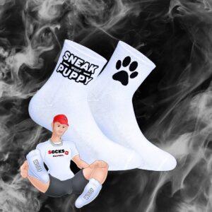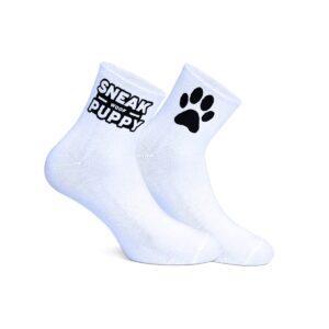 Calcetines blancos con un corte corto.Con las palabras Sneak Woof Puppy escritas a cada lado y la palabra Wook a cada lado (debajo de los pies) Calcetines blancos con un corte cortoComposición: 85% Algodón, 10% Poliamida, 5% Elastano Composición: 85% Algodón, 10% Poliamida, 5% Elastano
