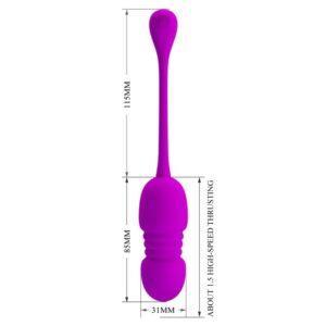 Huevo vibrador con 12 funciones de vibración y 12 funciones de movimiento thrusting. Cuenta con un control remoto inalámbrico y función memoria.