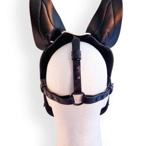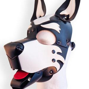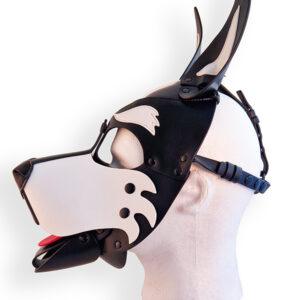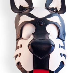 Gorro con cabeza de perro y orejas puntiagudas.Contraste en blanco y negro.Con bozal y lengüeta desmontables.Circunferencia máxima de la cabeza de 65 cm.De imitación (poliuretano).Dimensiones: 40 x 20 x 16 cm.