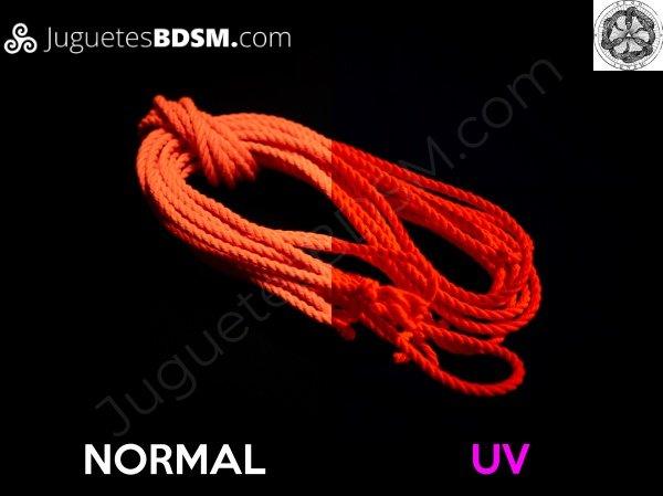 Cuerda neón para shibari. Color: amarillo o naranja. Grosor: 5 mm (ver más abajo). Cierres: Nudo Matthew Walker doble. 100% poliéster, suave al tacto, genera muy poca temperatura por fricción.