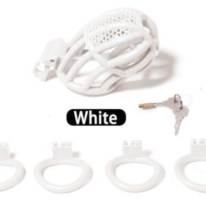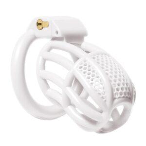 La jaula de castidad Netia M permite limitar la erección. Aquí se muestra en su versión blanca.Se compone de: una longitud interior de 7,5 cm una anchura de 3,1 cm un aspecto microperforado en la parte superior. Con anillos de fijación de 40 mm, 43 mm, 46 mm y 49 mm de diámetro. De plástico ABS