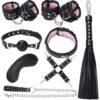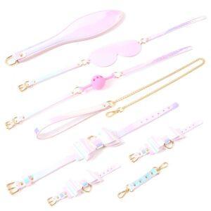 Kit Sm rosa con 5 accesorios: collar-correa, antifaz, mordaza de bola, paleta y esposas con lazo.La mordaza es de silicona.Los demás accesorios son de polipiel rosa brillante.