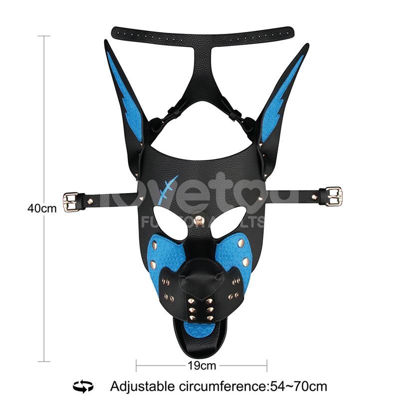 Elaborada en PU de primera calidad, esta máscara presenta una base texturizada en negro intenso con llamativos detalles azules, incluyendo un detalle de cicatriz grabado que añade una sensación de intensidad de batalla. La larga lengua azul y el hocico estructurado crean una estética de cachorro feroz e inmersiva, pero con un toque especial: tanto la lengua como el hocico son completamente extraíbles, ofreciendo opciones de juego versátiles para todos los gustos.