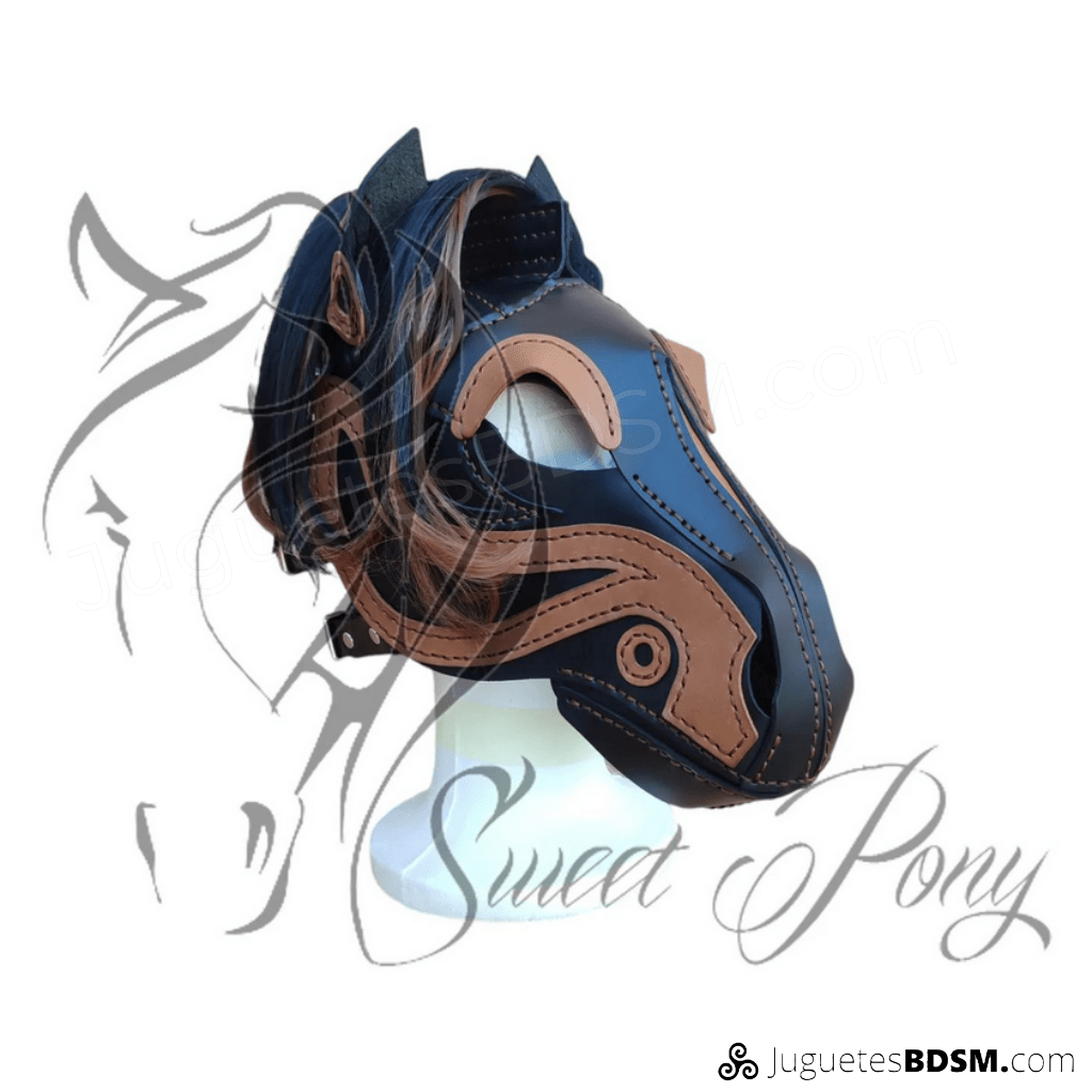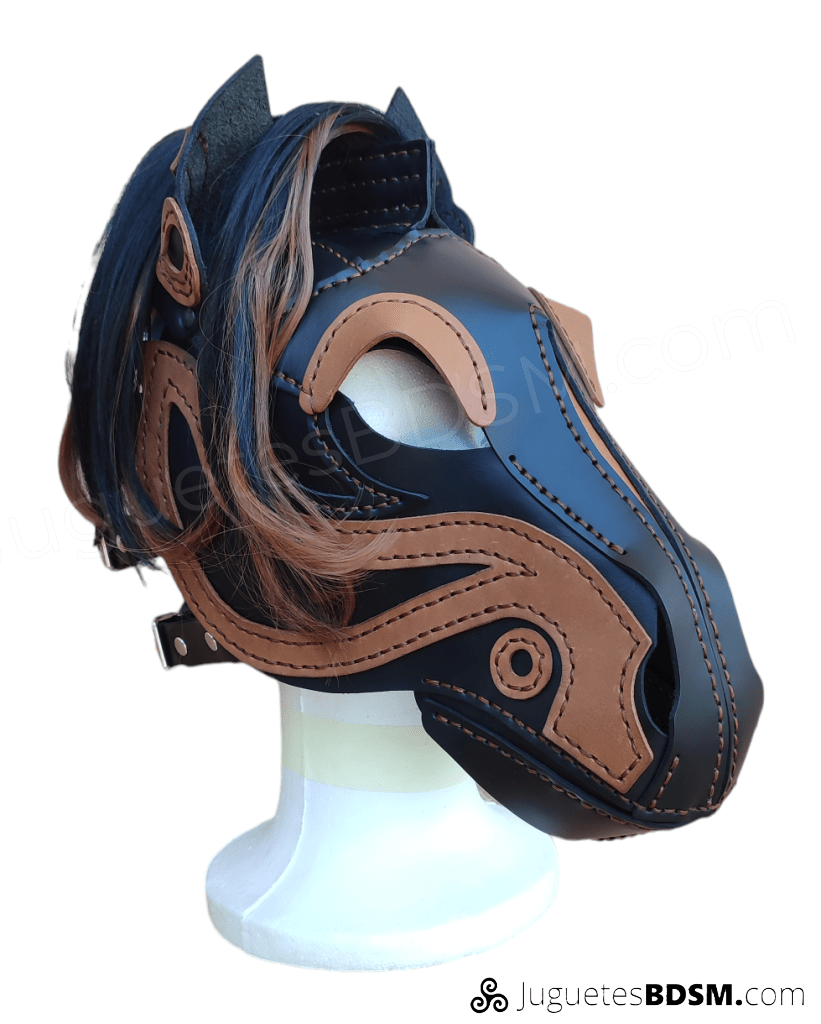 Esta máscara de pony consta de, casi en su totalidad, costuras a mano con técnicas artesanales, pelo en la crin color negro y sus cierres con correas ajustables, remaches y hebillas en color negro🖤