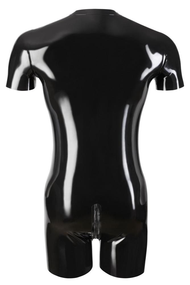 Este mono de látex se compone de un top de manga corta y unos pantalones cortos.El top se puede abrir en el torso con una cremallera.Otra cremallera está presente en los pantalones cortos para abrirse por delante y por detrás.Látex natural – espesor 0,4mm