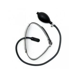 Mordaza de cuero con globo inflable y bomba. Las correas tienen 3 cm de ancho y se puede ajustar con una hebilla de metal en 8 posiciones desde 45 hasta 58 cm. Perfecto para vivir noches de BDSM sin límite.