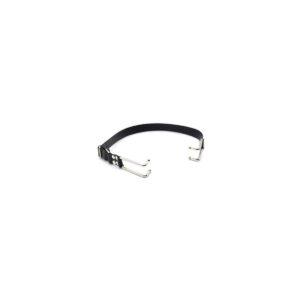 Mordaza separadora de labios en dos ganchos a cada lado. Ajustable por detras de la cabeza.
