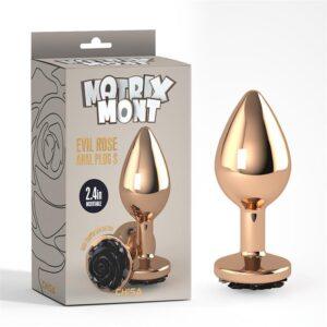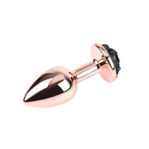 Plug anal de metal perfecto para principiantes. Cuenta con una base de corazón con una joya en forma de rosa en color nero. Su punta es redondeada y su cuello alargado y delgado, perfecto para una inserción y extracción segura y cómoda.